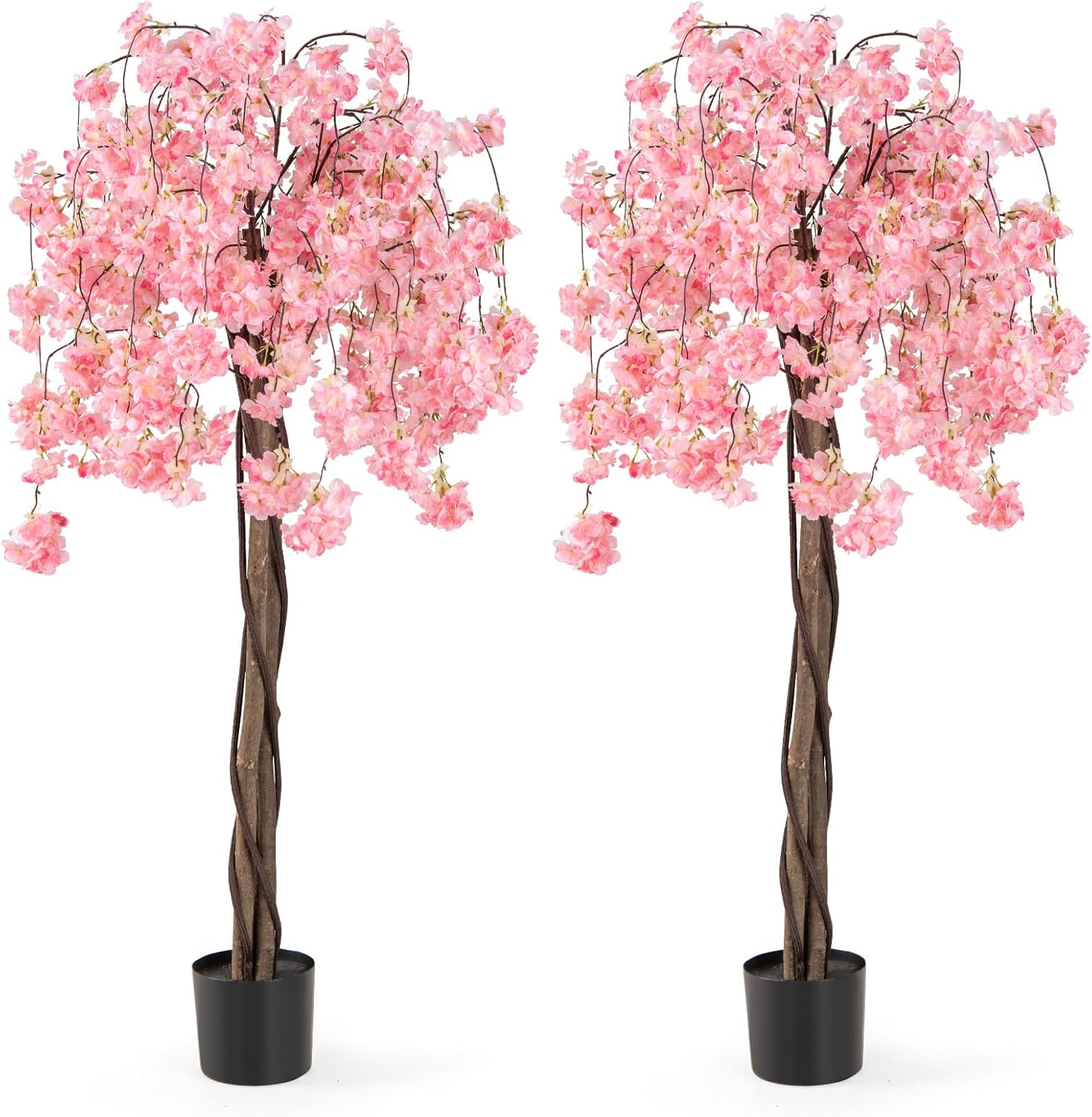 DescriptionExperience the Timeless Elegance of Cherry Blossoms Year-Round! Our 5.5 ft lifelike artificial cherry blossom tree features cascading branches and gradient color flowers, designed to evoke the beauty of a springtime bloom. Each tree is crafted with realistic wood trunks and reliable polyester flowers, giving it a lifelike appearance and feel. The sturdy base, filled with built-in cement, ensures the tree remains stable and upright in any indoor setting. Perfectly suited for any room, it enhances spaces with its serene and natural beauty, making it an ideal decor choice for homes, offices, and special events. Moreover, this tree requires no maintenance; there is no need for water, sunlight, or pruning - simply place it, and enjoy the splendor it brings to your environment. FeatureFeatures a graceful drooping design and flowers with color gradients Mimics real cherry blossoms, offer a perennial spring ambiance The real wood trunks with rattans add a serene and natural elegance The polyester flowers ensure durability and long-lasting beauty Features a stable flowerpot with built-in cement, prevent wobbling or tipping over Free maintenance, not be affected by seasons, keep vitality all the time Ideal for decorating your home, office, wedding, front door porch, balcony, etc Warm tips, if leaves or flowers fall off, just stick them back in SpecificationColor: Pink/White Material: Polyester Fabric, PP, PE, Solid Wood Tree Height: 65” Pot Size: 7” x 5.5” (Dia. x H) Net Weight of a Single Tree: 10 lbs Net Weight of 2 Trees: 20 lbs Package Includes: 1 x Artificial Cherry Blossom Tree
