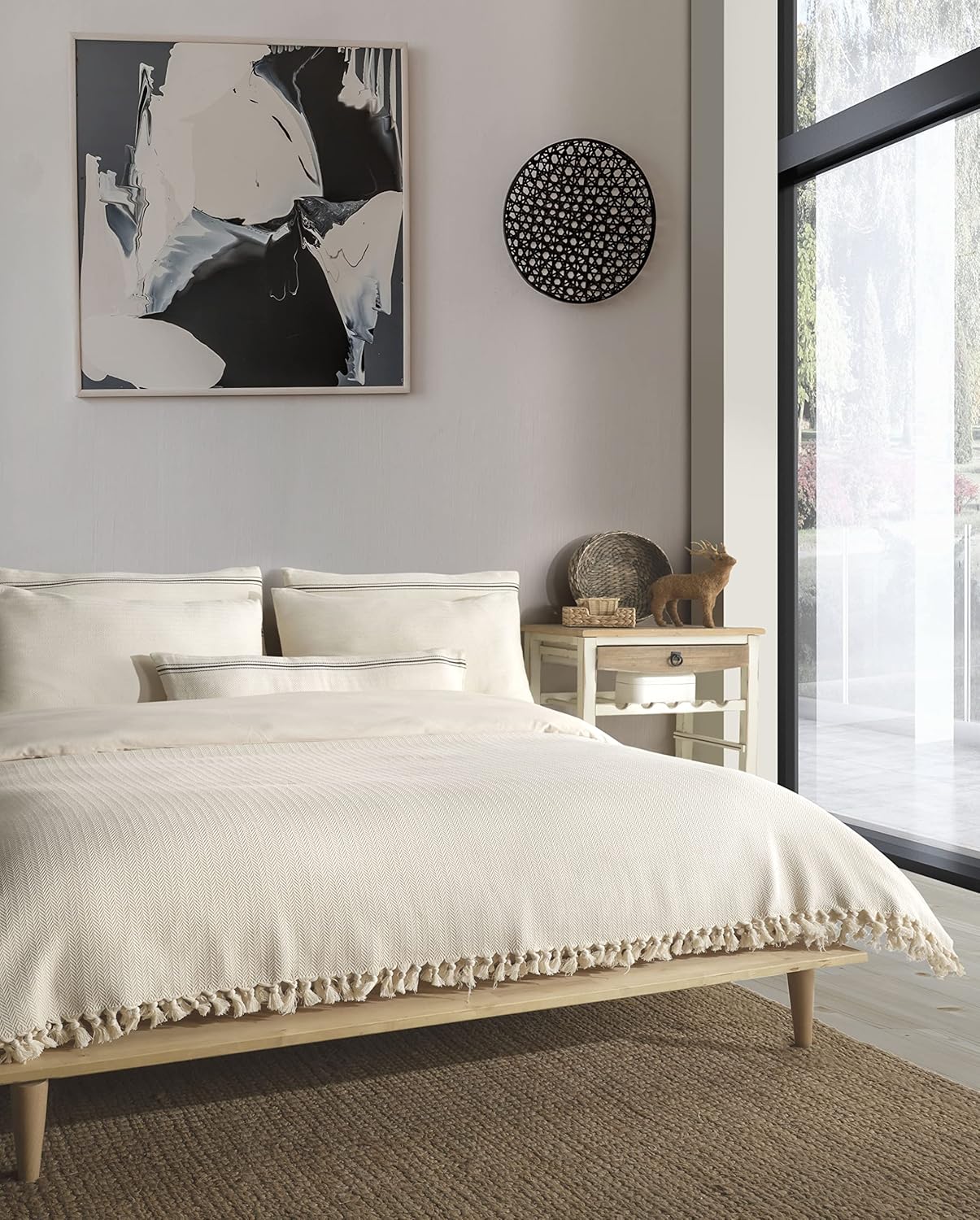 Handmade with care from natural pure cotton, this Queen size blanket coverlet offers elegant simplicity and breathable comfort for larger beds. Produced in small batches by skilled artisans, it has a soft, lightweight feel suitable for all seasons. The breathable cotton weave promotes natural airflow, helping maintain a comfortable sleeping environment year-round. Designed for flexible styling, this coverlet can be used as a bedspread, layered coverlet, or decorative accent at the foot of the bed. Finished with delicate all-around fringes, it brings a refined handcrafted touch that complements modern, farmhouse, minimalist, and bohemian bedroom décor. Please note that this item is made from undyed natural cotton. The natural cotton fiber has a soft ivory to creamy tone, not a bright white. Slight shade variations are normal and reflect the authentic, untreated nature of the fabric.